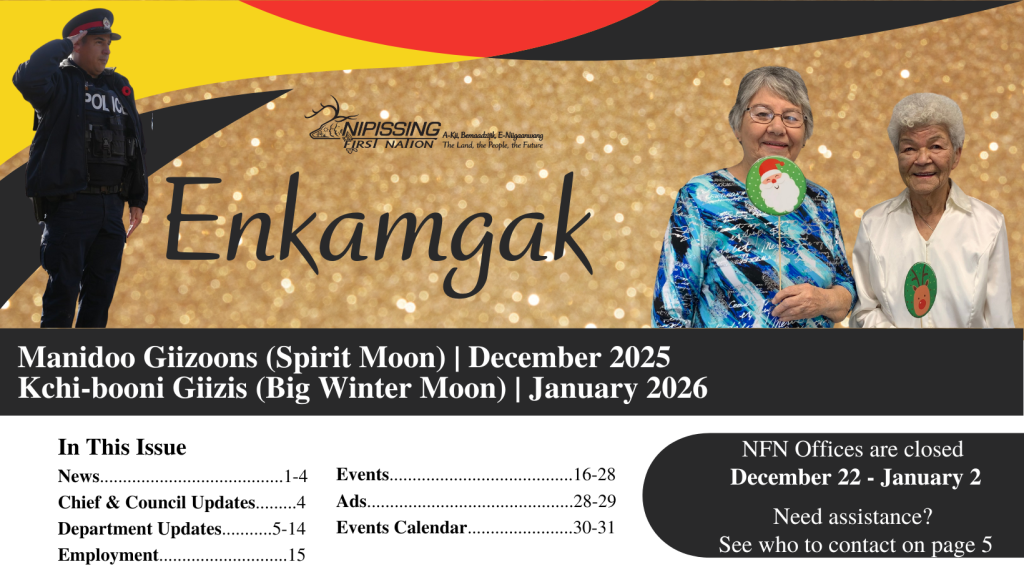 Read the December 2025/January 2026 issue of Enkamgak and access past issues. If you have any questions, comments or suggestions, please contact: Hillary Shabogesic, Wiinmaaged Ezhwebak (Communications Manager)705-753-2050 ext. 1270 | [email protected]