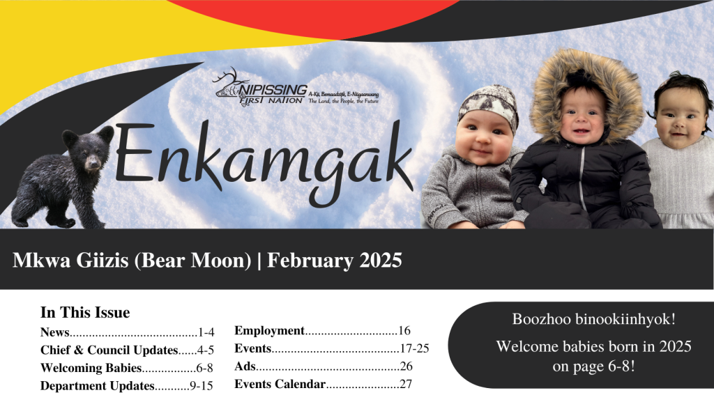 Read the February 2026 issue of Enkamgak and access past issues. If you have any questions, comments or suggestions, please contact: Hillary Shabogesic, Wiinmaaged Ezhwebak (Communications Manager)705-753-2050 ext. 1270 | [email protected]