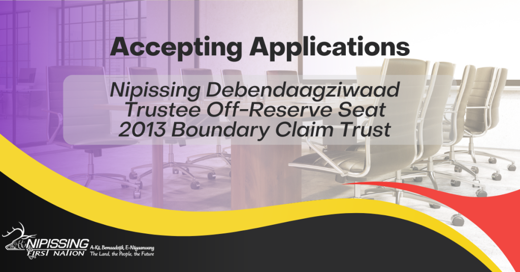 Nipissing Debendaagziwaad who meet the following conditions are eligible to apply for the off-reserve seat on the Board of Trustees for the Nipissing First Nation 2013 Boundary Claim Trust: Interested Nipissing members shall provide the following information: As required under the…